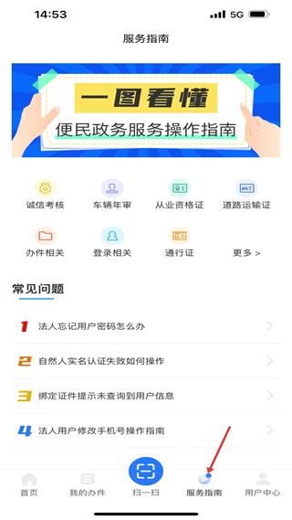 3、服務指南,有政務服務操作指南,涵蓋誠信考核等事項,還有常見問題解答,如法人忘密碼、實名認證失敗等指引。