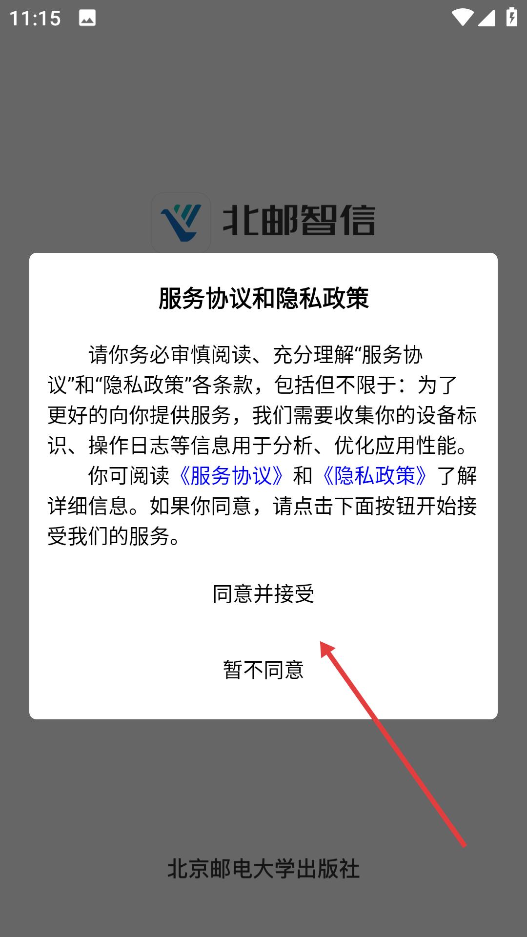 1、下載安裝完成后進入,需在用戶協議和隱私政策界面點擊同意,接受相關條款后才能進入應用。