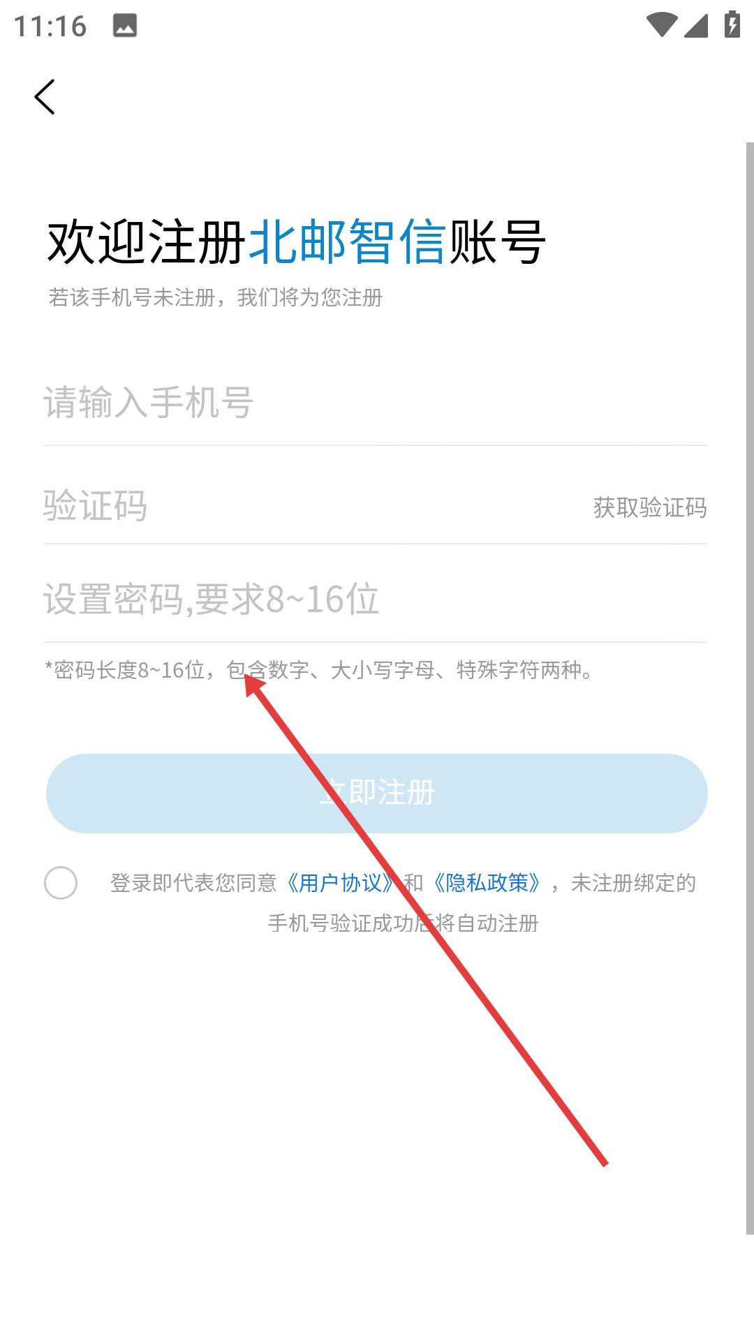 3、進入北郵智信注冊頁面,依次輸入手機號、獲取并填入驗證碼,再按要求設置密碼,點擊立即注冊完成注冊。