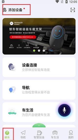 1、開啟小明加油APP,在底部導航欄點擊娛樂,進入娛樂頁面后,找到添加設備選項并點擊,按指引完成車載設備添加流程。