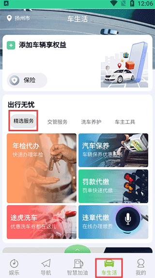 3、切換至車生活板塊,在出行無憂分類下,選定精選服務,瀏覽并按需選擇年檢代辦、罰款代繳等車生活服務。