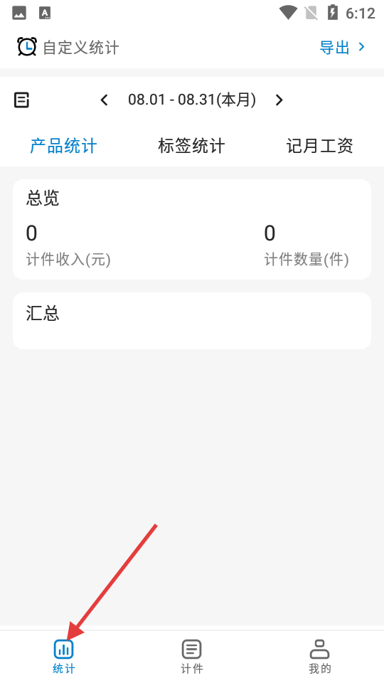 1、統計頁面,能進行自定義統計,展示本月計件收入和數量等數據,還具備導出功能,方便數據整理與分析。