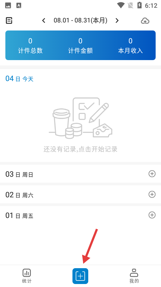 2、計件頁面呈現本月計件相關信息,當前暫無記錄,提示點擊開始記錄,可便捷記錄每日計件情況。
