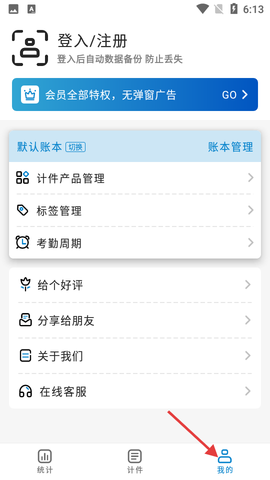 3、我的頁面提供登入注冊入口,含賬本管理、產品及標簽管理等功能,還有會員特權介紹與客服等服務選項。