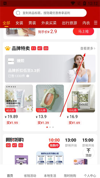 2、在主界面找到品牌特賣板塊,點擊查看更多,瀏覽該板塊下的各類商品,選擇感興趣的品牌商品,點擊進入對應的商品列表頁面。