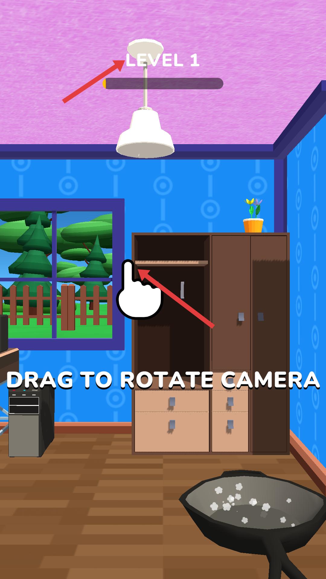 1、進入LEVEL1房間,按提示拖動旋轉視角,找到衣柜,點擊衣柜內指定層板,觸發互動,開啟本關破壞任務,利用場景物品推進流程。