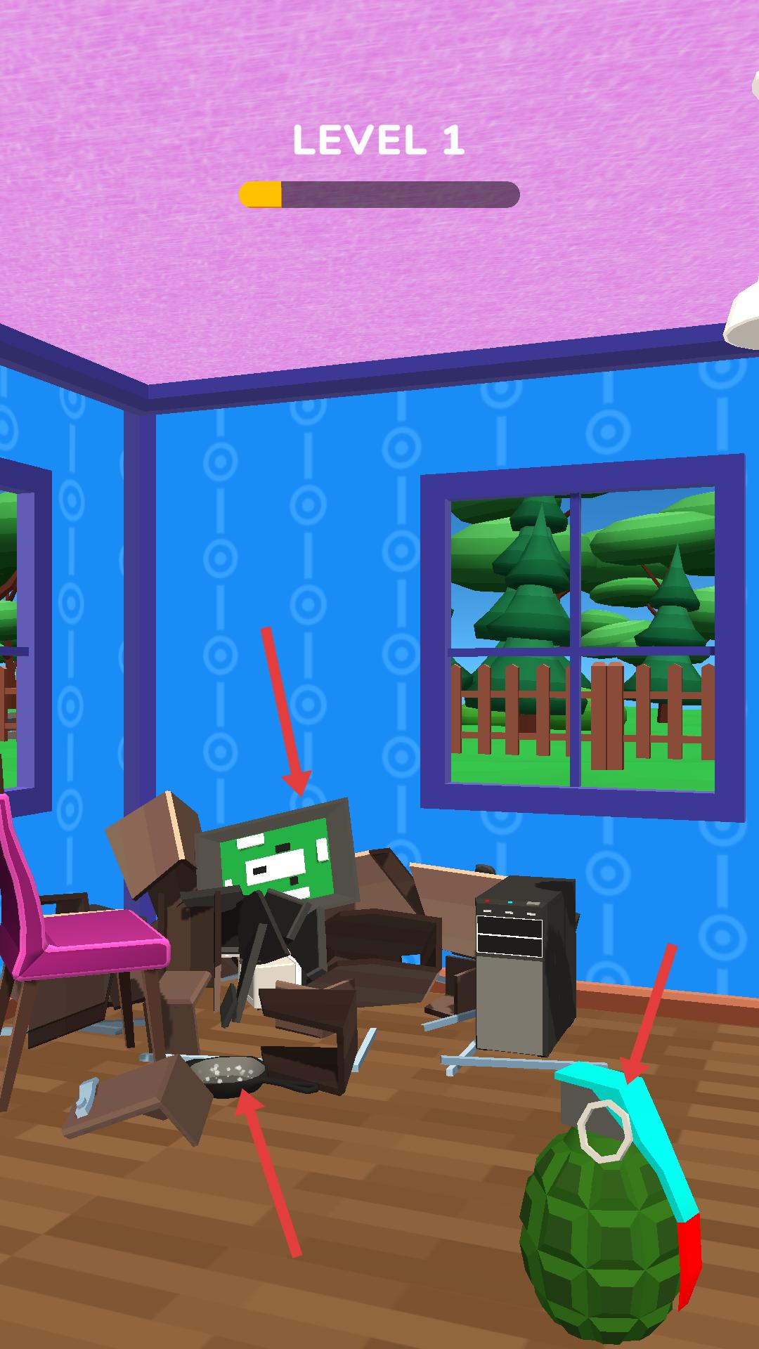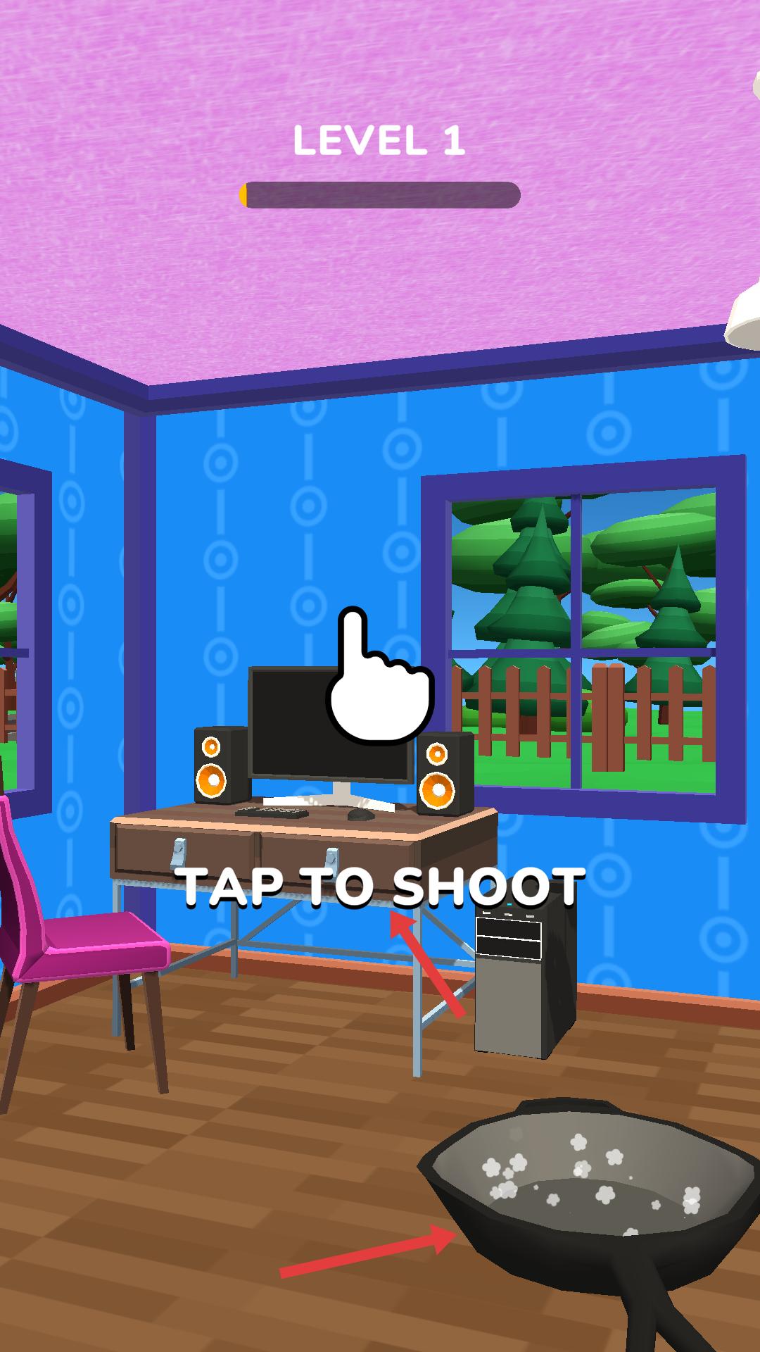 2、在房間內,依據箭頭所指提示,點擊電腦桌區域,用平底鍋射擊,精準操作摧毀目標,注意利用場景布局,高效完成破壞任務。