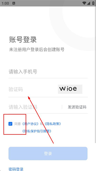 1、進入賬號登錄頁,輸入手機號,查看驗證碼后輸入對應內容,勾選同意用戶協議等相關條款,確認信息無誤后點擊登錄按鈕,完成賬號登錄進入軟件。