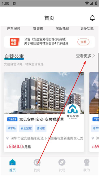 2、登錄后進入首頁瀏覽停車服務等功能入口,查看公告內容,點擊自營公寓板塊的查看更多,了解安居自營公寓的相關房源信息。