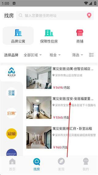 3、切換到找房頁面選擇品牌公寓等房源類型,通過品牌區域租金等條件篩選,瀏覽展示的房源列表,點擊目標房源查看詳細信息。