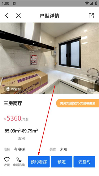 4、進入戶型詳情頁查看房源面積裝修等信息,點擊VR看房查看房屋實景,根據需求選擇預約看房預定或去簽約按鈕,推進租房流程。