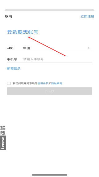 1、登錄板塊支持手機號、郵箱登錄聯想賬號,需閱讀并同意使用條款和隱私聲明,完成后可進入下一步,開啟APP使用之旅。