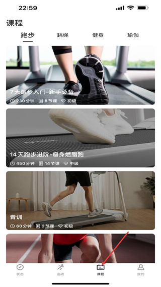 2、課程板塊有跑步、跳繩等分類,如7天跑步入門、14天跑步進階課程,滿足不同運動水平用戶的健身需求,課程信息清晰明了。
