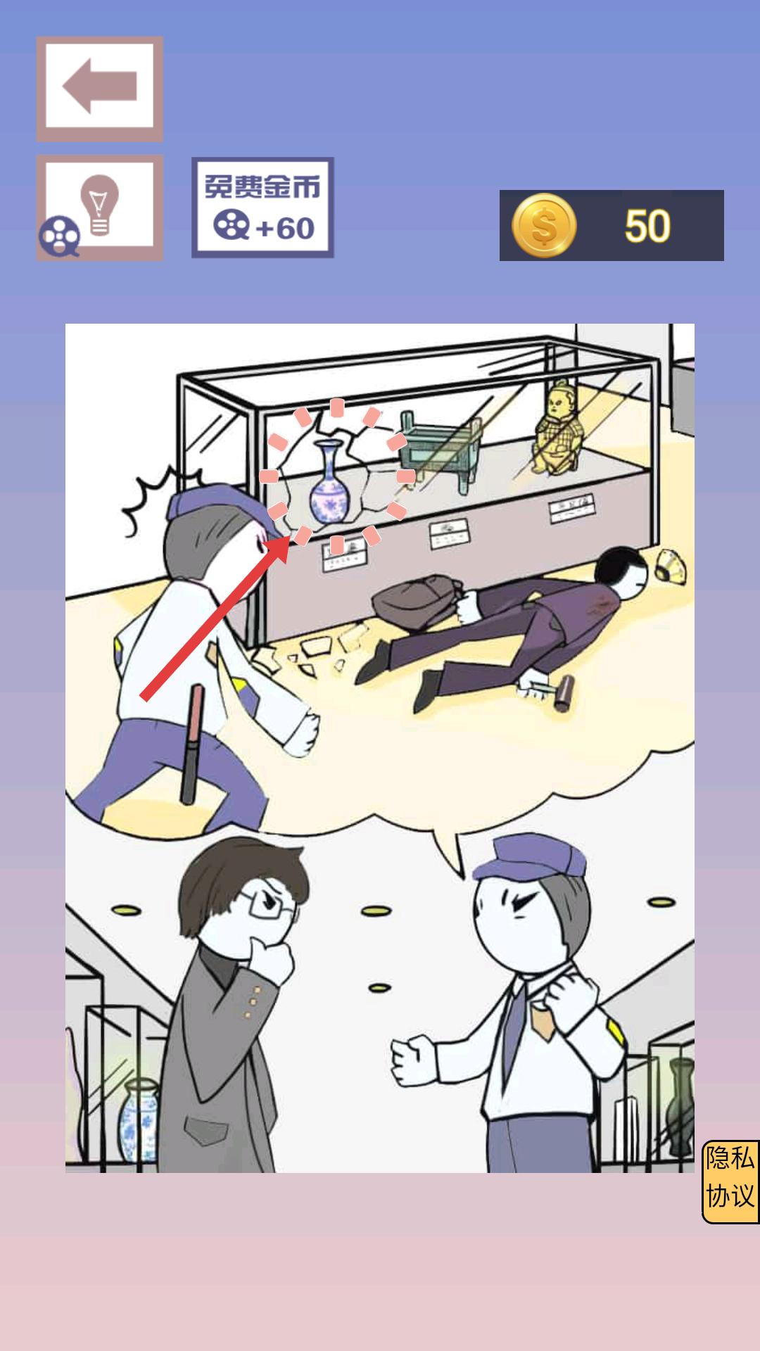 2、在案發現場場景里,仔細觀察并點擊被敲破玻璃的展示柜,這是推進案件調查的關鍵操作,能獲取重要線索。