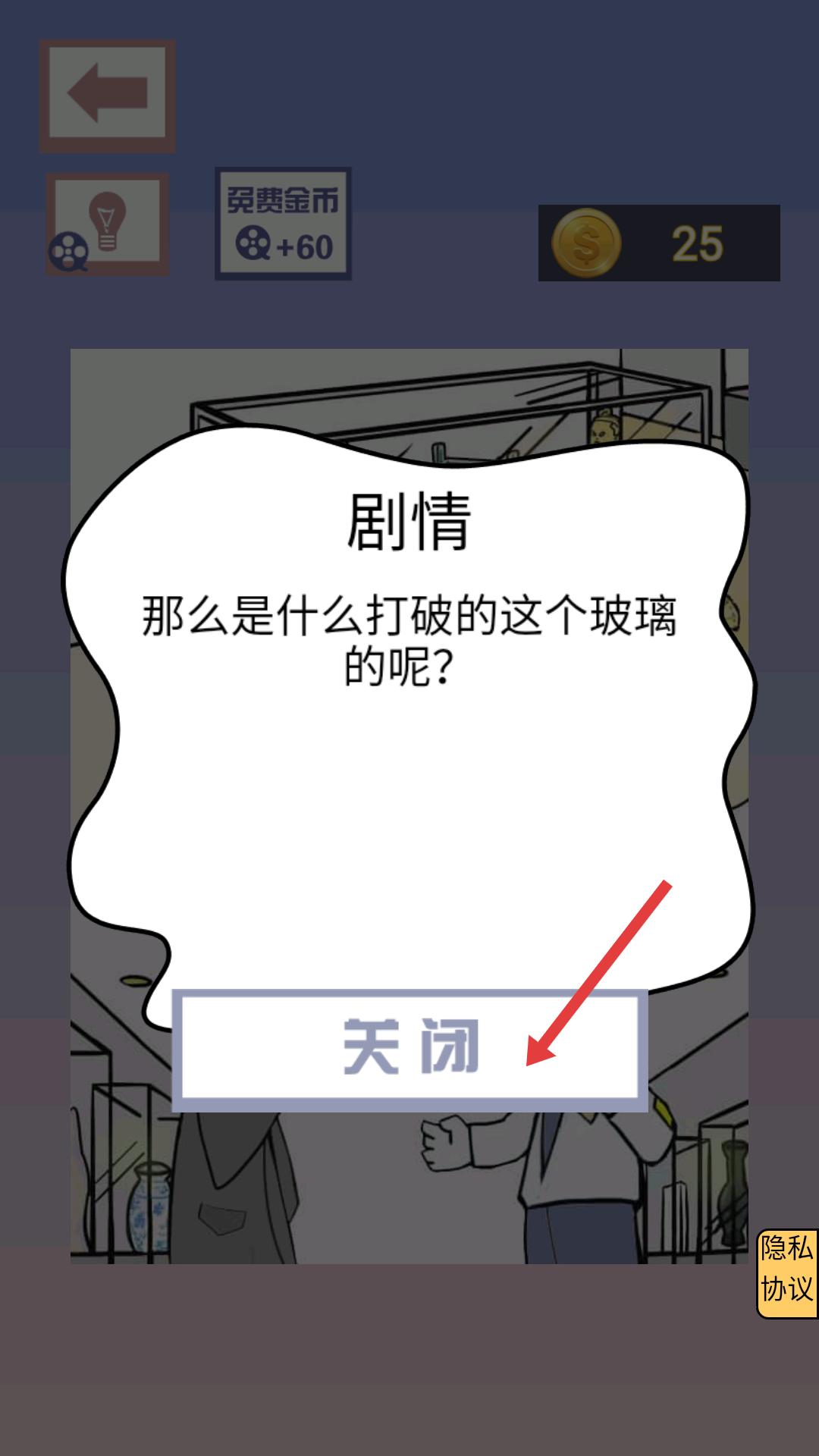 4、看到劇情提示框詢問打破玻璃的物品,先閱讀問題,然后點擊關閉按鈕,準備進一步探索找出打破玻璃的東西。