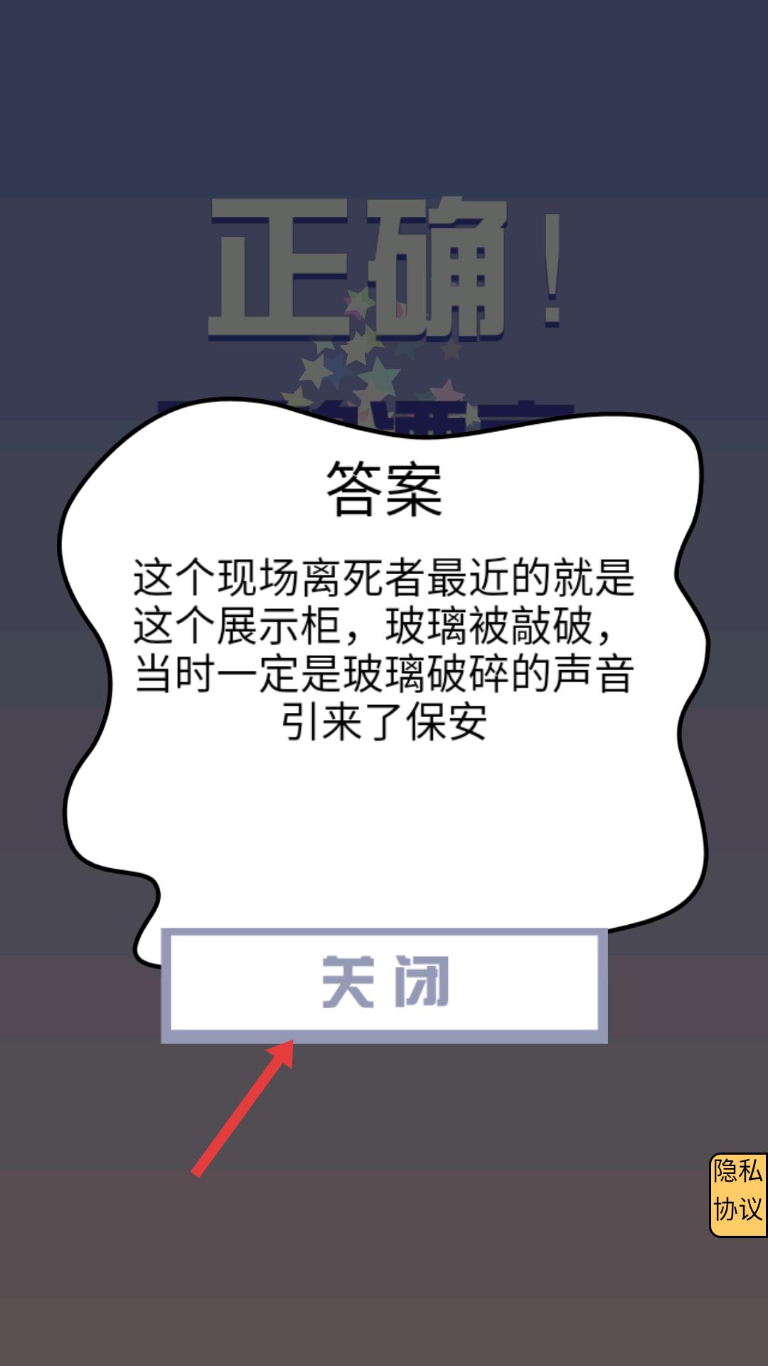 3、成功推理后,會出現答案提示框,閱讀完關于展示柜玻璃破碎引保安的內容后,點擊關閉按鈕,繼續后續流程。