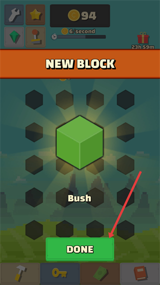 2、會出現新的方塊,比如標注Bush的綠色方塊,點擊DONE,就能把這個新方塊放到游戲區域里。