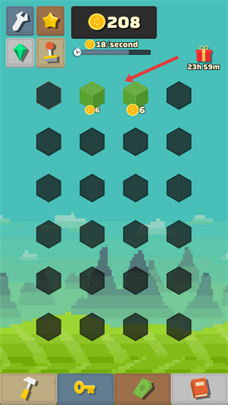 3、放置好新方塊后,繼續合并相同的方塊,像綠色方塊,每次合并都能積累金幣,金幣數量會不斷增加。