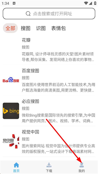 1、進入應用首頁,頂部設搜索欄,含搜圖、識圖等功能標簽,展示花瓣、百度搜圖等搜圖渠道,點擊底部我的按鈕,進入個人界面。