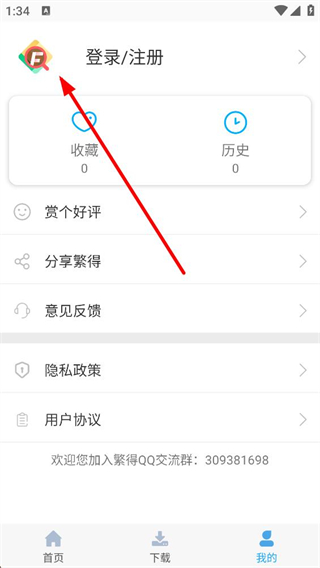 2、進入我的界面后,顯示登錄、注冊入口,還有收藏、歷史等功能選項,點擊登錄、注冊,進入登錄頁面。