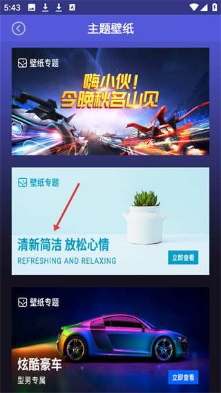 2、主題壁紙界面,呈現賽車、清新簡潔、炫酷豪車等多個壁紙專題,滿足用戶不同喜好的壁紙瀏覽需求。