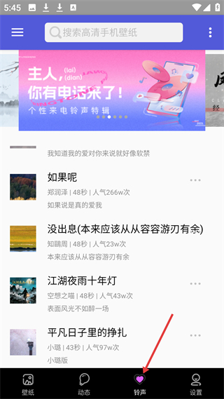 3、鈴聲界面,展示如果呢、沒出息等多款熱門鈴聲,標注演唱者、時長和人氣,方便用戶選個性化來電鈴聲。
