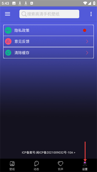 4、設置界面,有隱私政策、意見反饋、清除緩存選項,還顯示ICP備案號,保障應用合規性和用戶使用體驗。