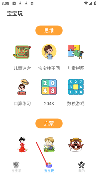 4、寶寶玩板塊設置思維和啟蒙板塊,思維板塊有迷宮、數獨等益智游戲,啟蒙板塊含趣味內容,讓兒童在游戲中提升能力。