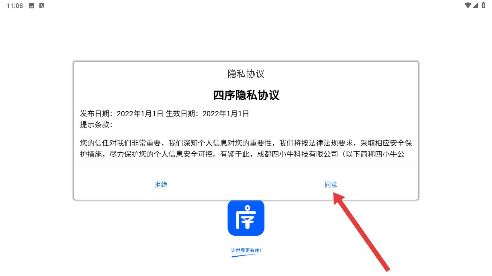 1、打開四序應用,彈出隱私協議彈窗,仔細閱讀四序隱私協議內容,確認無誤后點擊同意,進入歡迎使用四序頁面。