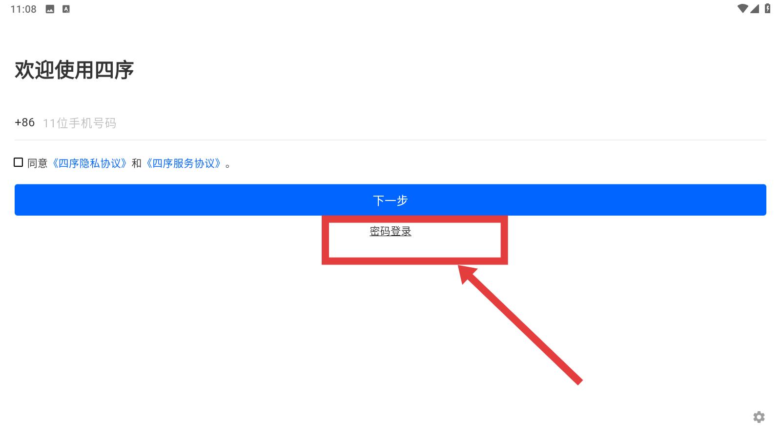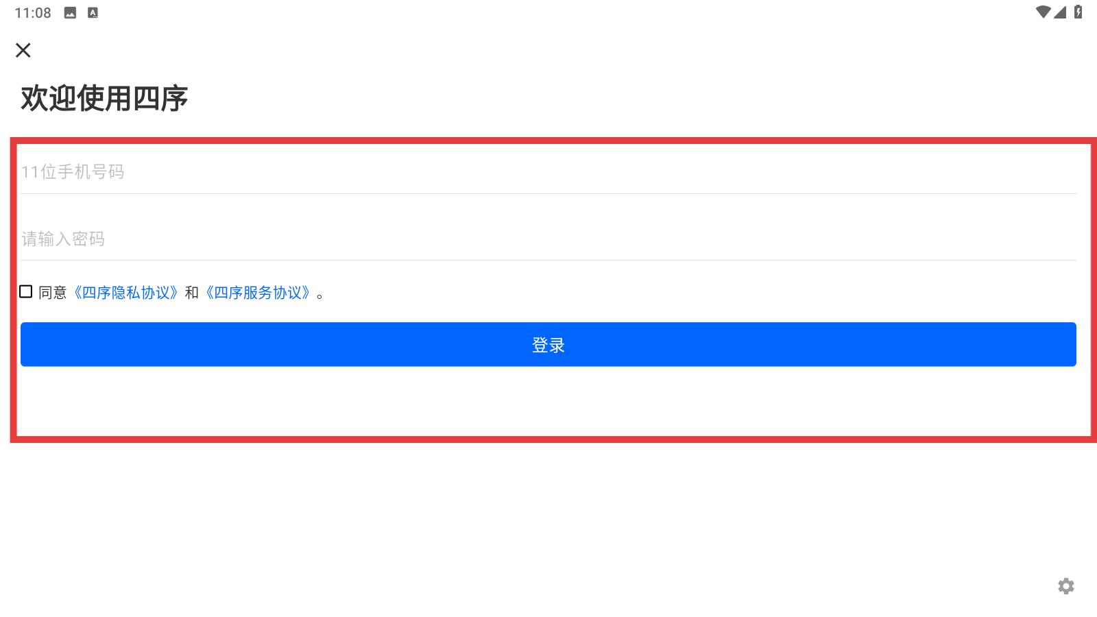 3、在密碼登錄界面,依次輸入11位手機號碼、密碼,勾選同意四序隱私協議和四序服務協議,點擊登錄按鈕,完成賬號登錄操作。