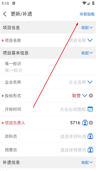 4、填寫完成后點擊存剪貼板,保存填寫的信息,以便后續使用或提交,完成更新補遺。