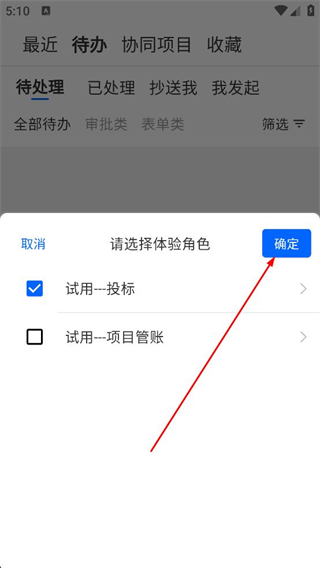 1、打開辦公協同類APP,進入角色選擇頁面,選擇體驗角色,如試用-投標,點擊確定進入應用頁面。