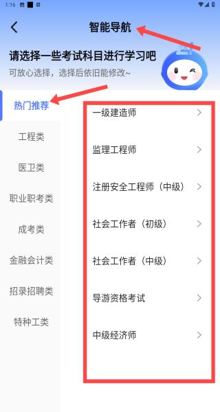 1、益題庫手機版智能導航頁面,熱門推薦欄展示多種考試科目,如一級建造師等方便考生選擇。
