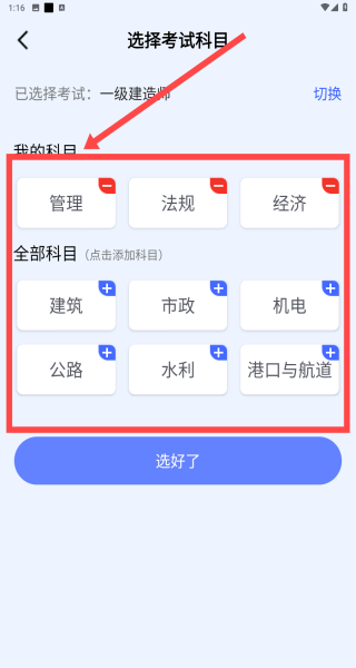 2、益題庫手機版選擇考試科目界面,選定一級建造師后可在我的科目和全部科目中添加具體學科。