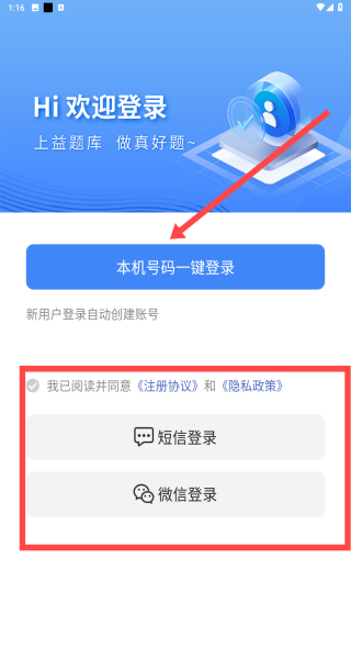 3、益題庫手機版登錄界面,提供本機號碼一鍵登錄、短信登錄和微信登錄方式,需勾選協議后進行登錄操作。