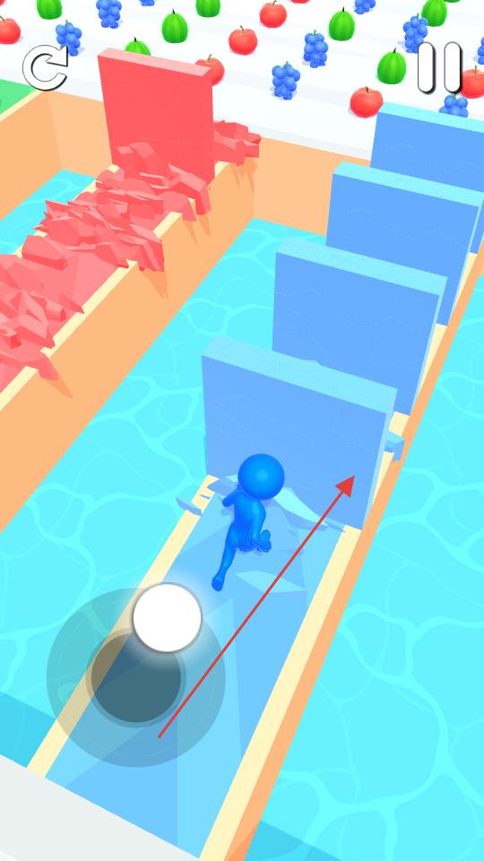 3、角色進入帶有藍色方塊的通道后,繼續操控角色前進,利用收集后的水果突破阻礙,向終點方向奔跑。