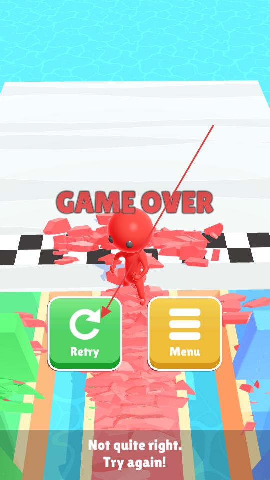 4、若游戲失敗屏幕顯示GAMEOVER,點擊綠色的Retry按鈕,重新開始游戲,再次嘗試操控角色收集水果、突破障礙,爭取成功通關。