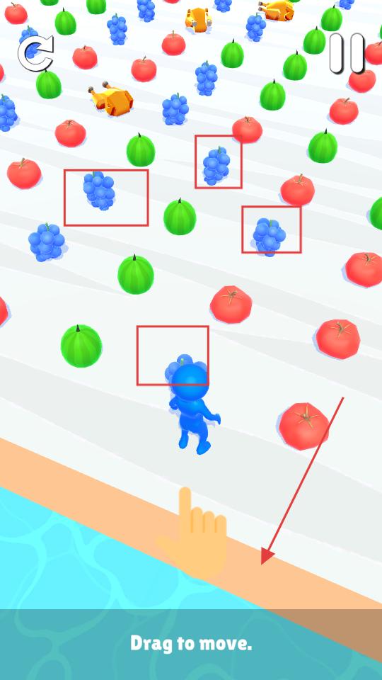 2、通過拖拽屏幕來控制藍色角色移動,在水果場地中朝著藍色葡萄等目標移動,收集這些水果,同時注意避開其他障礙物。
