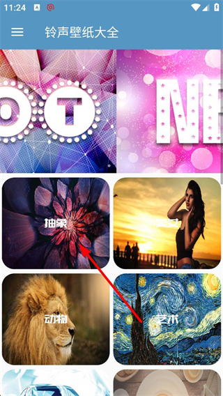 1、進入鈴聲壁紙大全頁面,可見抽象美女等多種風格分類板塊,選擇抽象分類,即可進入該風格對應的壁紙展示頁面,瀏覽相關壁紙內容。