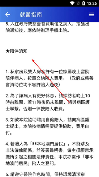 3、繼續瀏覽就醫指南內容查看陪伴須知部分,了解家屬陪護的相關規定及注意事項。