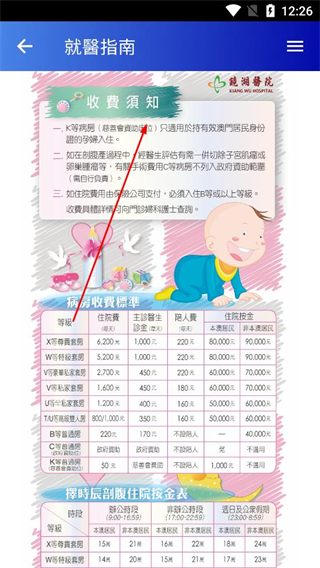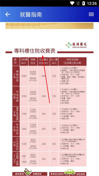2、在就醫指南頁面查看惠科樓住院收費表,了解不同病房類型對應的住院費主診醫生費等收費標準。