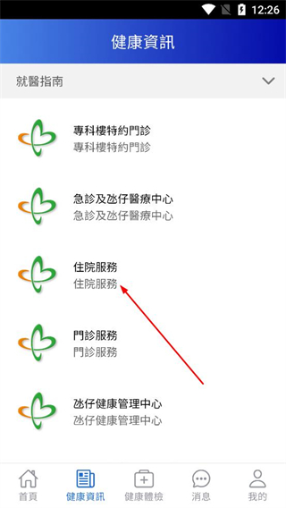 1、打開鏡湖通軟件,進入健康資訊頁面選擇住院服務選項,進入就醫指南的住院相關內容界面。