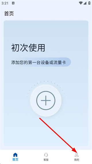 1、進入飛貓管家首頁,顯示初次使用提示,可添加設備或流量卡,點擊底部我的選項,即可進入個人相關操作界面。