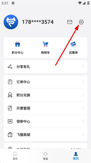 2、進入我的界面,能看到綁定的手機號,還有積分中心購物車等功能,點擊右上角設置圖標,可進入設置頁面。