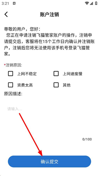 4、進入賬戶注銷頁面,需選注銷原因并填描述,確認信息后點擊確認提交,提交后客服會15個工作日內處理。