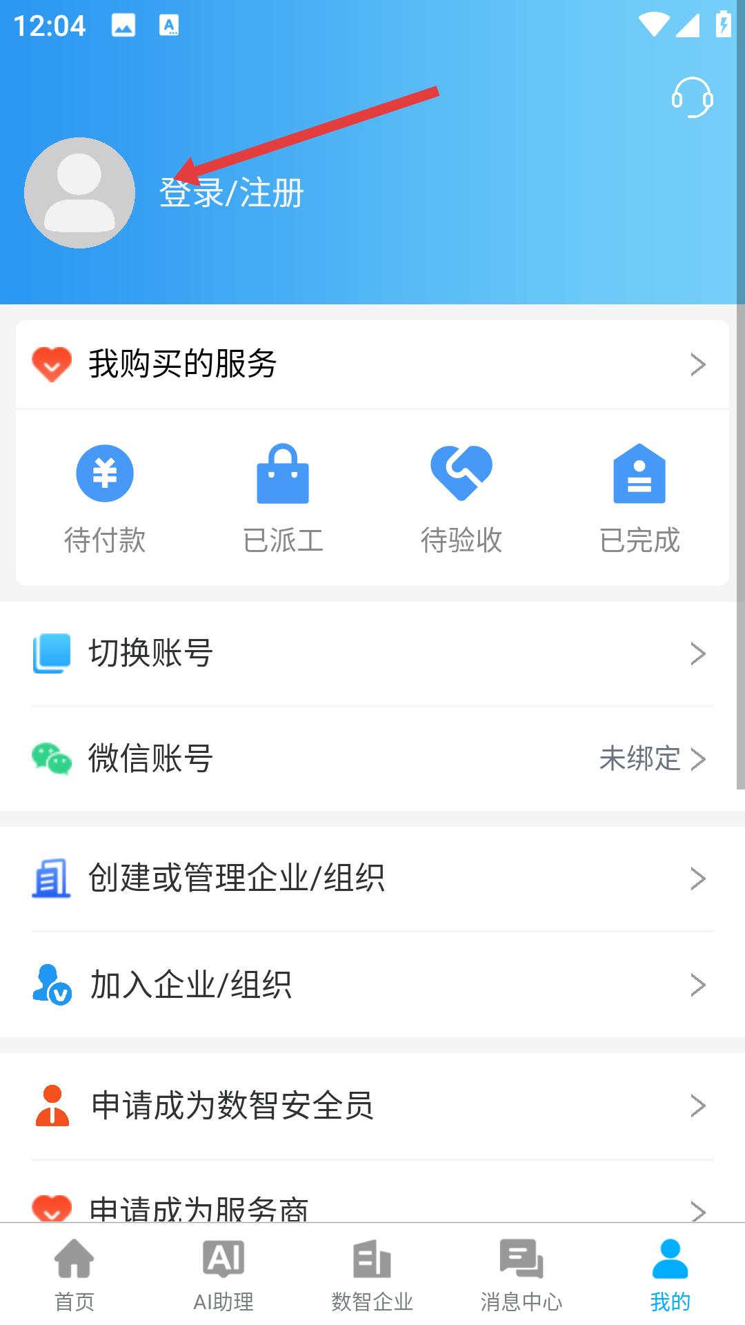 2、進入我的頁面,可登錄、注冊賬號,查看我購買的服務狀態,還有切換賬號、綁定微信等功能,助力管理企業安全服務相關業務。