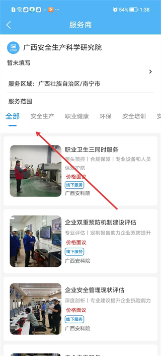 2、在服務商頁面可查看廣西安全生產科學研究院的服務區域和范圍,瀏覽職業衛生三同時服務等具體服務項目。
