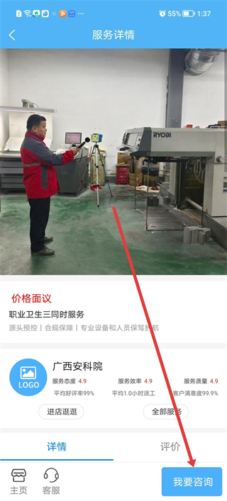 4、進入職業衛生三同時服務詳情頁,查看服務介紹和服務商評分,點擊我要咨詢按鈕,可向服務商咨詢相關服務內容。