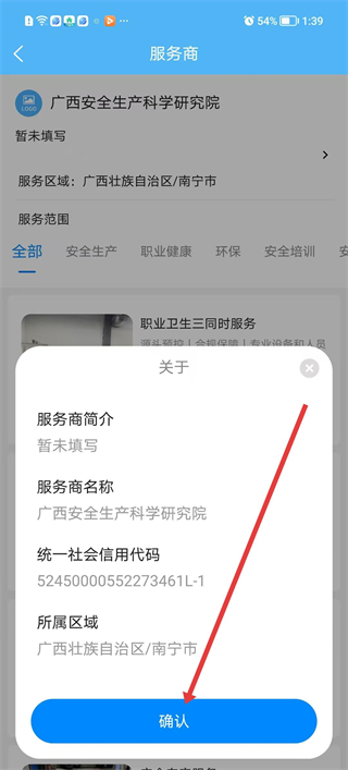 3、點擊服務商名稱查看關于彈窗里的服務商簡介、統一社會信用代碼等信息,了解服務商詳情后點擊確認關閉彈窗。