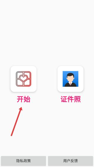 1、點擊應用初始界面,有開始和證件相框兩大選項,簡潔明了,下方還設有隱私政策與用戶反饋入口。